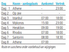 Nadien cruisen we langs enkele Griekse eilanden: Mykonos, het eiland dat nooit slaapt, Kreta, het bakermat van de Minoïsche beschaving, Rhodos, het gezellige eiland en tenslotte Santorini, het mooiste
